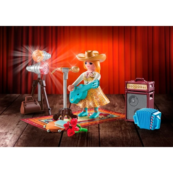 | Inhalt/Ausstattung | Figuren: 1 Countrysängerin; Zubehör: 1 Tamburin, 1 Gitarre, 1 Akordeon, 1 Teppich, 1, Scheinwerfer, 1 Tasche, 1 Verstärker, 1 Lautsprecher, 1 Mikrofon m. Ständer, 1 Blumenstrauß, 1 Stift, 1 Lippenstift, 1 Buch | ||