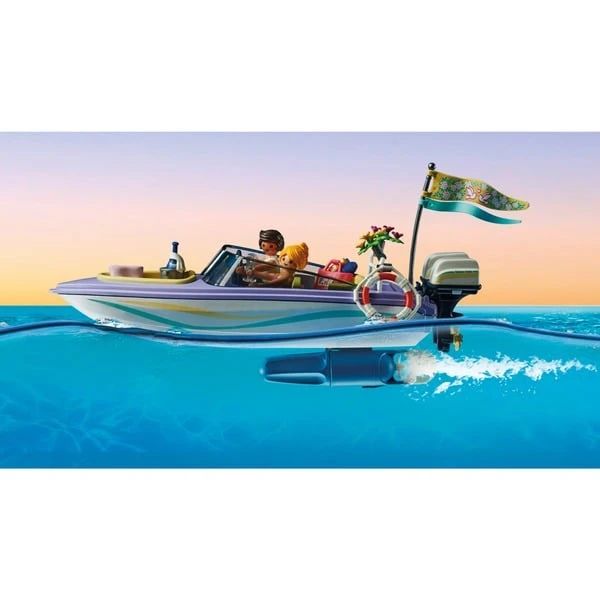Frisch getraut startet das verliebte Paar aus PLAYMOBIL City in seine Hochzeitsreise. Dafür haben die beiden extra ein Motorboot gemietet. Mit Schwung fahren sie hinaus aufs Meer, dort wird erst einmal eine Pause eingelegt. Die Frischvermählten setzen sich auf das Sonnendeck und genießen das tolle Wetter. Anschließend ziehen sie die Badesachen an und springen ins Wasser. Diese Flitterwochen werden ein wunderbares Erlebnis!Art.-Nr.: 1888865